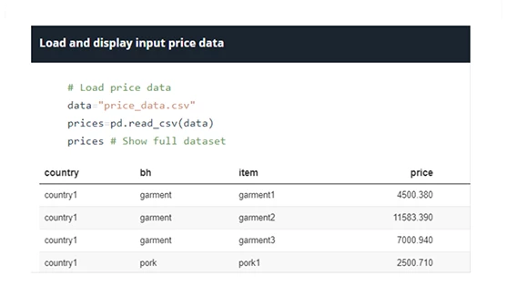 We start by loading the input dataset containing mock average price data and other relevant country-level information. A review of the price and expenditure data required to estimate PPPs is provided in the World Bank Data Blog How does the ICP measure price levels across the world?