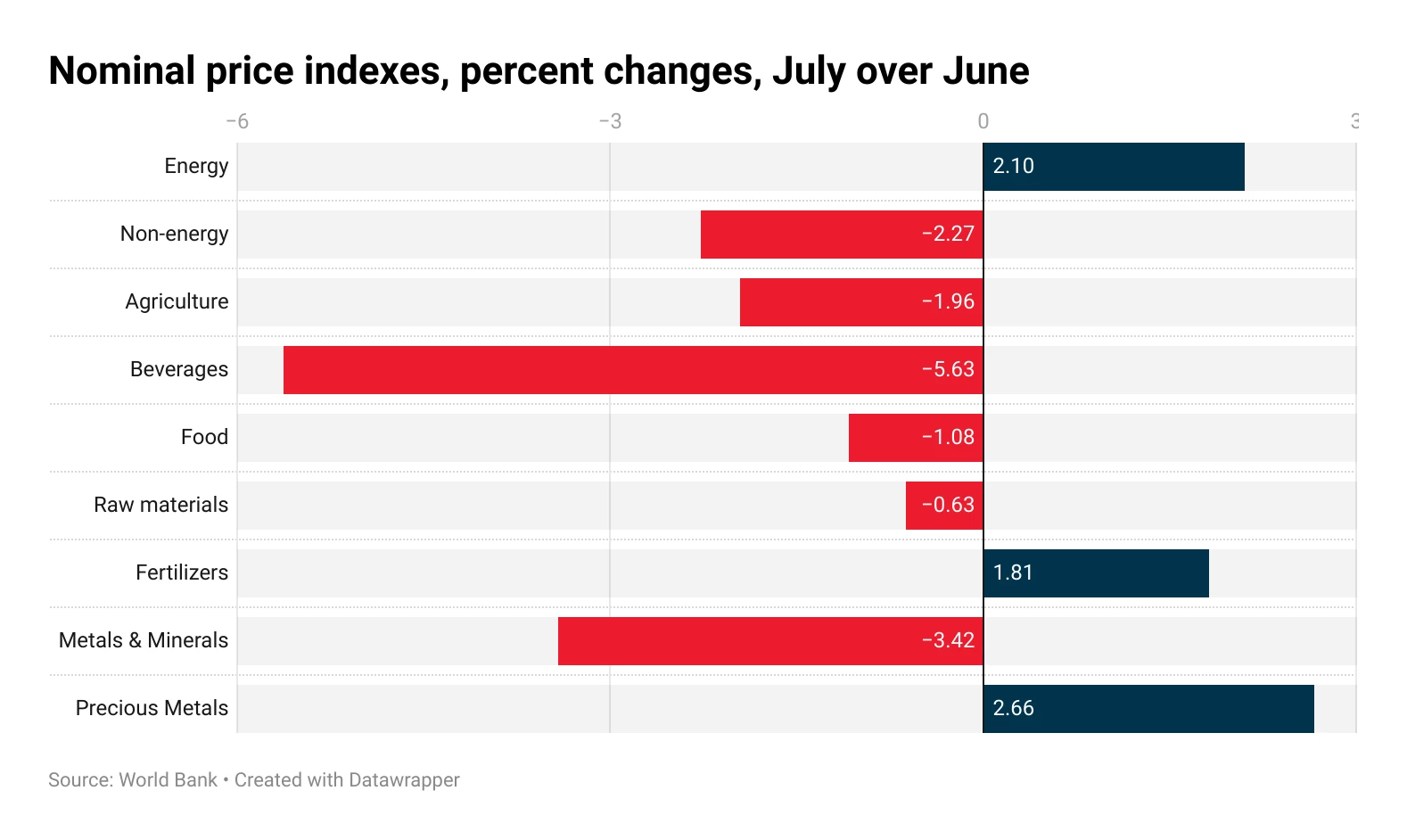 Energy prices gained 2.1% in July, with crude leading the increase (+2.5%), the World Bank's Pink Sheet reported. Non-energy prices fell by 2.3%.