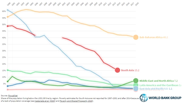 Figure 1 Poverty rates at the US$1.90 line, by region 1990-2018