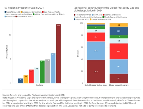 Figure 1: Sub-Saharan Africa has the highest Prosperity Gap and contributes the most to the Global Prosperity Gap, followed by South Asia
