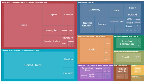 Global trade has increased more than fivefold over the last thirty years with the volume of worldwide exports growing from $4.3 trillion in 1990 to $24.8 trillion in 2019. This trade is facilitated through an intricate web of bilateral, multilateral and Regional Trade Agreements (RTAs) recognized by the World Trade Organization (WTO). As of November 2020, there were 305 active RTAs in force, significantly up from 22 active RTAs in 1990. In addition, a significant portion of these are directly linked to the rise of regional trading blocs with varying degrees of integration, from loose free trade agreements to full-fledged monetary unions. The latest of these is the Regional Comprehensive Economic Partnership (RCEP), announced on November 15th, 2020, which is set to become the largest trading bloc in the world, notably by incorporating China, which was not previously part of any trading bloc. Another notable development is the African Continental Free Trade Area (AfCFTA), where trading is expected to begin on January 2021, according to the African Union.