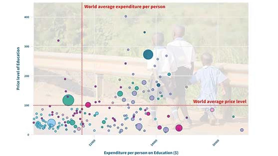 Today, on International Education Day – January 24 – we delve into data published by the International Comparison Program (ICP) on the expenditure on education around the world and the relative price of education. Universal access to education – the focus of Sustainable Development Goal 4 – is one of the strongest instruments for reducing poverty and improving health, gender equality, peace, and stability. But how much do households and governments spend on education in different economies across the globe? And how much does the relative cost of education differ depending on location? Scroll through our interactive story below to find out more.