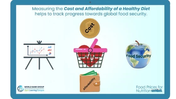 Measuring how easily people can access safe, sufficient, and nutritious food is crucial to tracking progress towards achieving food security – one of the most pressing development goals of recent times, especially in low- and lower-middle-income countries. The new online training course Cost and Affordability of a Healthy Diet and other Indicators from Food Prices for Nutrition introduces the concept of measuring the cost of a diet that supports an active life and long-term health using prices of locally-available foods, and subsequently assessing whether this cost is affordable to the local population.