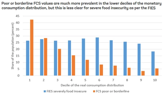 Figure 1. Poor or borderline FCS values are much more prevalent in the lower deciles of the monetary consumption distribution, but this is less clear for severe food insecurity as per the FIES