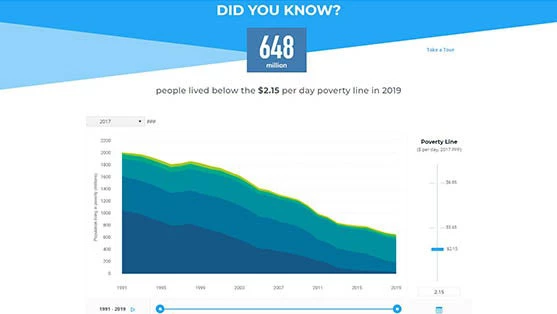 In this video, we review PIP’s Homepage and all the information comprised in it. The main graph tells users the total number of individuals currently living in poverty worldwide and where they live. This analytical graph can be easily adjusted to other values of the poverty line, and it is also possible to visualize the decreasing trend in global poverty over time by simply dragging the bottom slider. Hovering over the graph allows users to understand how this information breaks down across world regions.