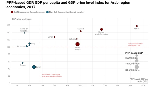 Comparing these economies with the rest of the world shows that Qatar was second only to Luxembourg in 2017 in terms of GDP per capita while the United Arab Emirates was in eighth place globally. Egypt was the least expensive country in the world, while Sudan was the third least expensive.