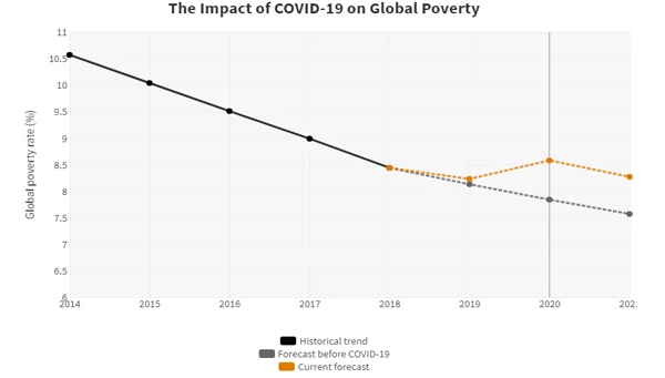 Such forecasts reveal that COVID-19 is likely to cause the first increase in global poverty since 1998 , when the Asian Financial Crisis hit. With the new forecasts, global poverty—the share of the world’s population living on less than $1.90 per day—is projected to increase from 8.2% in 2019 to 8.6% in 2020, or from 632 million people to 665 million people. Compare this with the projected decline from 8.1% to 7.8% over the same time period using the previous World Economic Outlook forecasts. The slight change from 8.2% to 8.1% for 2019 happens because the revised growth forecasts also changed for non-COVID reasons for some countries. Taking this into account, it means that COVID-19 is driving a change in our 2020 estimate of the global poverty rate of 0.7 percentage points — (8.6%-8.2%)-(7.8%-8.1%). Another way to put this is that the estimates suggest that COVID-19 will push 49 million people into extreme poverty in 2020 .