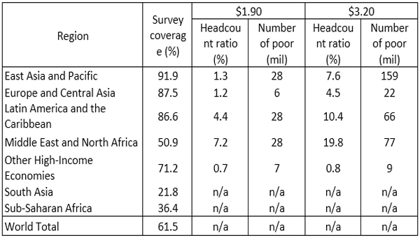 The table below shows the poverty estimates in 2018 for the regions where we have sufficient data. The data available at the time of the March 2020 update do not offer sufficient population coverage in 2018 for South Asia and Sub-Saharan Africa, so we are unable to publish regional poverty estimates for these two regions. Since these regions account for most of the global poor in recent years, we are also unable to provide a global poverty estimate for 2018 at this time. As further survey data in these two regions become available, we will update PovcalNet such that we can provide a global poverty estimate in the upcoming Poverty and Shared Prosperity report (to be published in the Autumn of 2020).