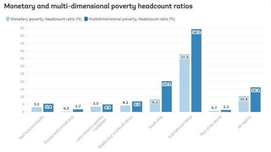Poverty has many dimensions that go beyond monetary measures of consumption or income. Multidimensional poverty measures, such as the Global MPI produced by UNDP and OPHI, try to take into account these multiple facets of poverty. Similarly, the World Bank’s Multidimensional Poverty Measure (MPM) seeks to understand poverty beyond monetary deprivations (which remain the focal point of the World Bank’s monitoring of global poverty) by including access to education and basic infrastructure along with the monetary headcount ratio at the US$1.90 international poverty line.