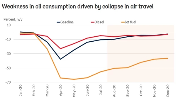 Weakness in oil consumption driven by collapse in air travel