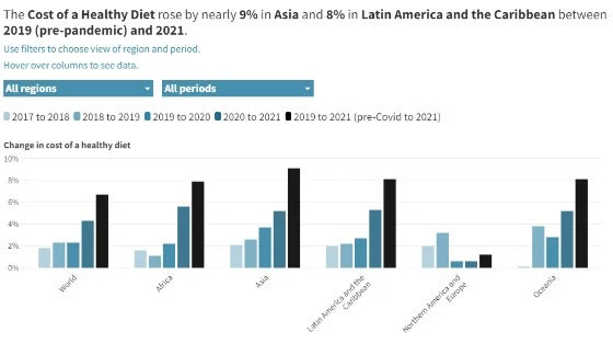 - In Africa, Asia, and Latin America and the Caribbean, the cost of a healthy diet increased by more than 5% between 2020 and 2021, negatively affecting all subregions except for Northern Africa, where the cost fell by 2.8%. Over the same period, the cost of a healthy diet rose in Oceania (5.2%) and in Northern America and Europe (marginally, by 0.6%).