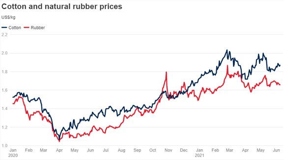 Prices of agricultural raw materials have sustained their upward momentum that began in the second quarter of last year. The Raw Material Price Index stands nearly 18% higher than a year ago, led by cotton and rubber prices. Raw material prices are expected to average 10% higher this year, compared to 2020, before stabilizing in 2022, according to the World Bank’s Commodity Markets Outlook.