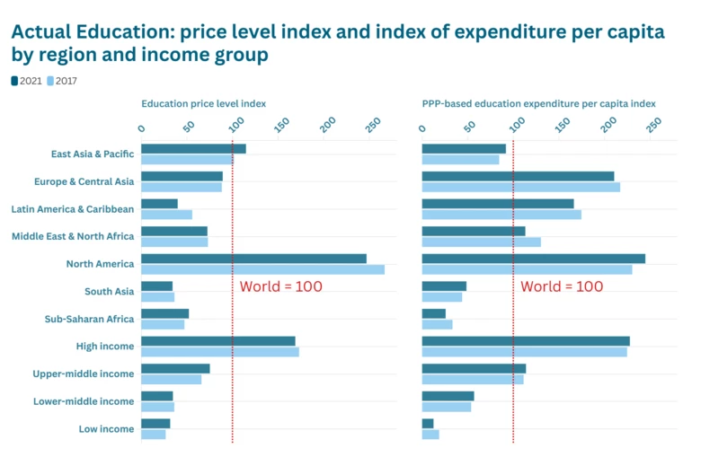 Results from the ICP 2021 cycle, published in May 2024, provide a new suite of data on the relative price levels of education across the globe, and what is spent on education - not only by governments, but also by households and nonprofit institutions that serve households. Scroll through the visual story below to see data by region and income group and across the two most recent ICP cycles, 2017 and 2021.