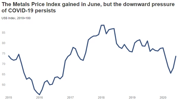 Metal prices surged 8.4% in June 2020, following a 3.7% rise in May, driven by a confluence of demand recovery in China and supply concerns in Latin America. However, prices are still 5.2% lower than at the start of the year due to the impact of COVID-19 containment measures. The World Bank Metals and Minerals Price Index is projected to average 13% lower in 2020 relative to 2019 on expectations of a subdued global economic recovery. This outlook is subject to several downside risks. Fears of a second wave of COVID-19 may force governments to re-impose stringent measures that could hamper metal demand. New stimulus measures in China—the world’s largest consumer of metals—may be less effective than expected because they include “new” infrastructure (such as 5G networks and electric vehicle charging stations), which are less metal-intensive than “traditional” infrastructure (such as rails and bridges).