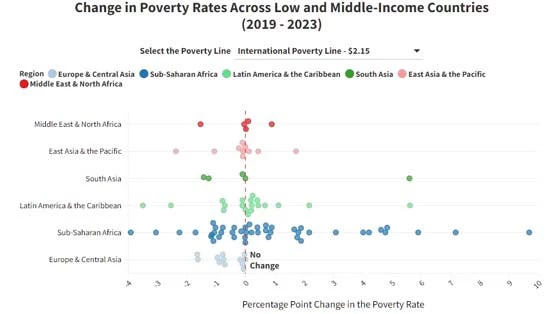Most regions include countries where poverty has gone up and countries where poverty has gone down. Sub-Saharan Africa stands out as a region with the most extreme outcomes. For instance, Mali is projected to have experienced a poverty increase of 7.2 percentage points between 2019 and 2023.