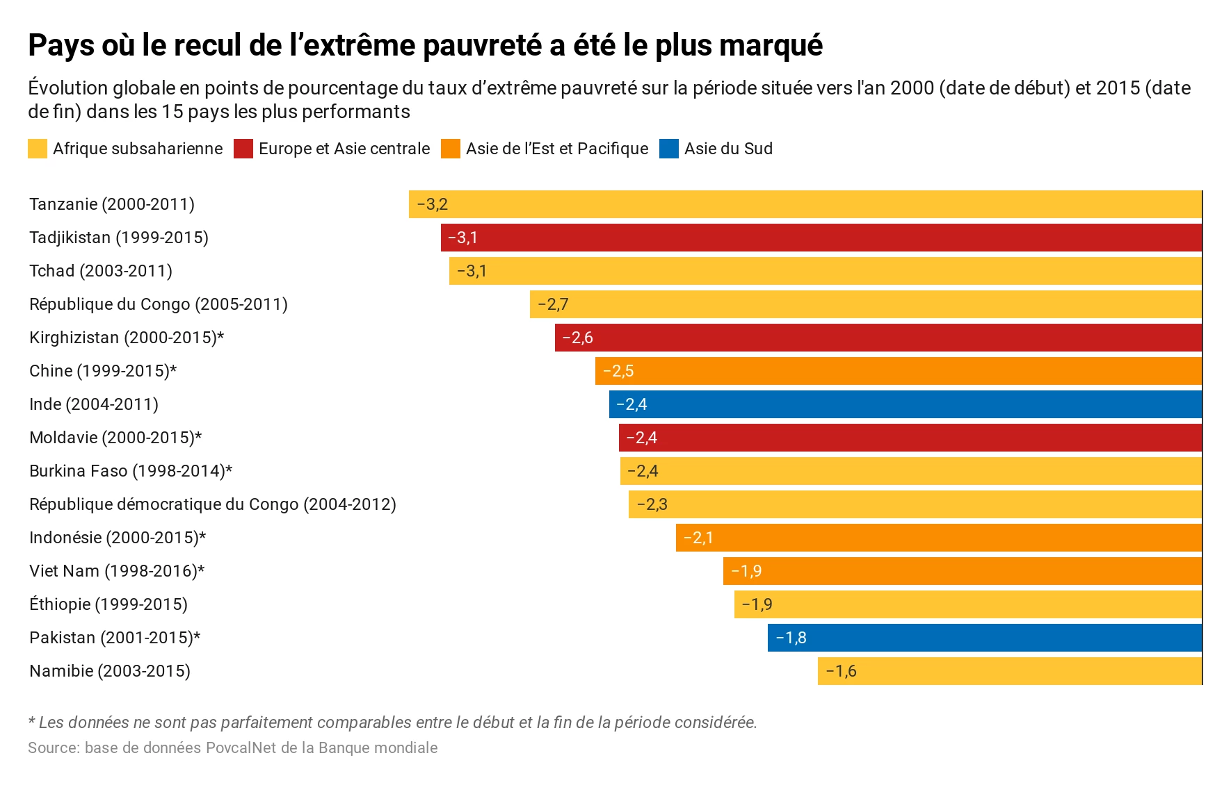 In each of these countries, an average of at least 1.6% of the population moved out of extreme poverty every year. This meant 802.1 million fewer people were living in extreme poverty in these 15 countries between 2000 and 2015. For example, between 2000 and 2011, the extreme poverty rate fell by 36.9 percentage points in Tanzania, from 86.0% to 49.1%, for an annual average rate of reduction of 3.2 percentage points, which led to a reduction of 5.3 million in the number of Tanzanians living in extreme poverty. Tajikistan, Chad, and the Republic of Congo had average reductions in poverty of around 3 percentage points per year.