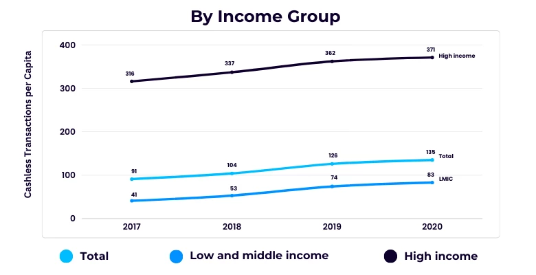 The use of non-cash payment methods is increasing globally, which are seen as safer, more efficient, and more inclusive. From 2017 to 2020, the annual number of cashless transactions per person globally rose from 91 to 135. Overall, this figure doubled in low and middle- income economies (LMICs), while the growth in high-income economies is estimated at 17 percent through the same period. Despite this progress, disparities in access to, and the use of, digital payments remain significant in LMICs.