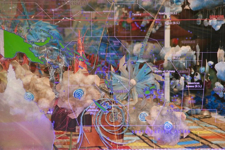 The sculpture was designed and built through a collaboration between Suarez and 20 local artists convened by the Foundation Suzanne Bastien in Port Vila, Vanuatu, using local imagery, materials, and techniques. Vanuatu, a country that is incredibly vulnerable to disasters has been greatly impacted by many severe natural events in recent years, including the eruption of Manaro Voui volcano on Ambae Island, which forced thousands of people to evacuate. Responding and building resilience to disasters is a way of life in the country and the Ni Vanuatu people often depict disasters in their art.