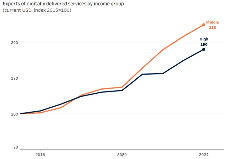 These are all examples of trade in digitally enabled services, a key driver of job creation, economic growth, and poverty reduction, particularly in developing economies. From 2015 to 2024, growth of exports in these services was 90 percent in high-income countries and 125 percent in lower and upper-middle income countries. Growth surged after the COVID-19 pandemic lockdowns prompted many more people to rely on digital services. Meanwhile, merchandise exports (not shown) grew by 47 percent from 2015 to 2024.