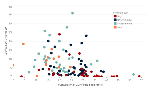 The Trade and Development Chart offers an answer. In countries that rely less on trade taxes, which include tariffs – and more on domestic taxes – revenue is higher as a proportion of GDP. In other words, domestic taxes deliver more fiscal firepower than tariffs on imports.