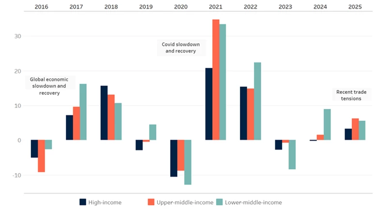 Despite recent trade tensions and heightened policy volatility, changes in export flows were relatively muted from January to April 2025. Exports rose only 3 percent to 6 percent year-on-year across country income groups in that four-month period. Trade volatility was greater during the global economic slowdown in 2016 and the COVID-19 pandemic in 2020 and the subsequent recovery years.
