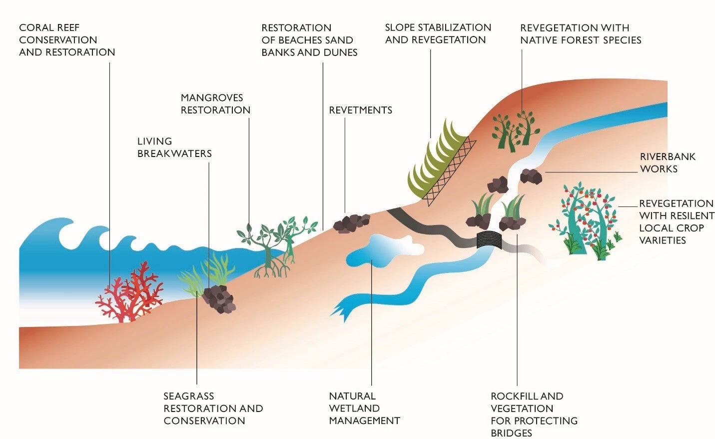 There is a growing recognition that nature can help support resilient recovery. “Nature-Based Solutions” (or NBS) are innovative approaches that harness natural capital to increase the resilience of communities and ecosystems while providing environmental, social and economic benefits. This includes restoring and leveraging natural vegetation, mangrove belts, coastal reefs, and other natural resources, to mitigate and adapt to climate impacts.