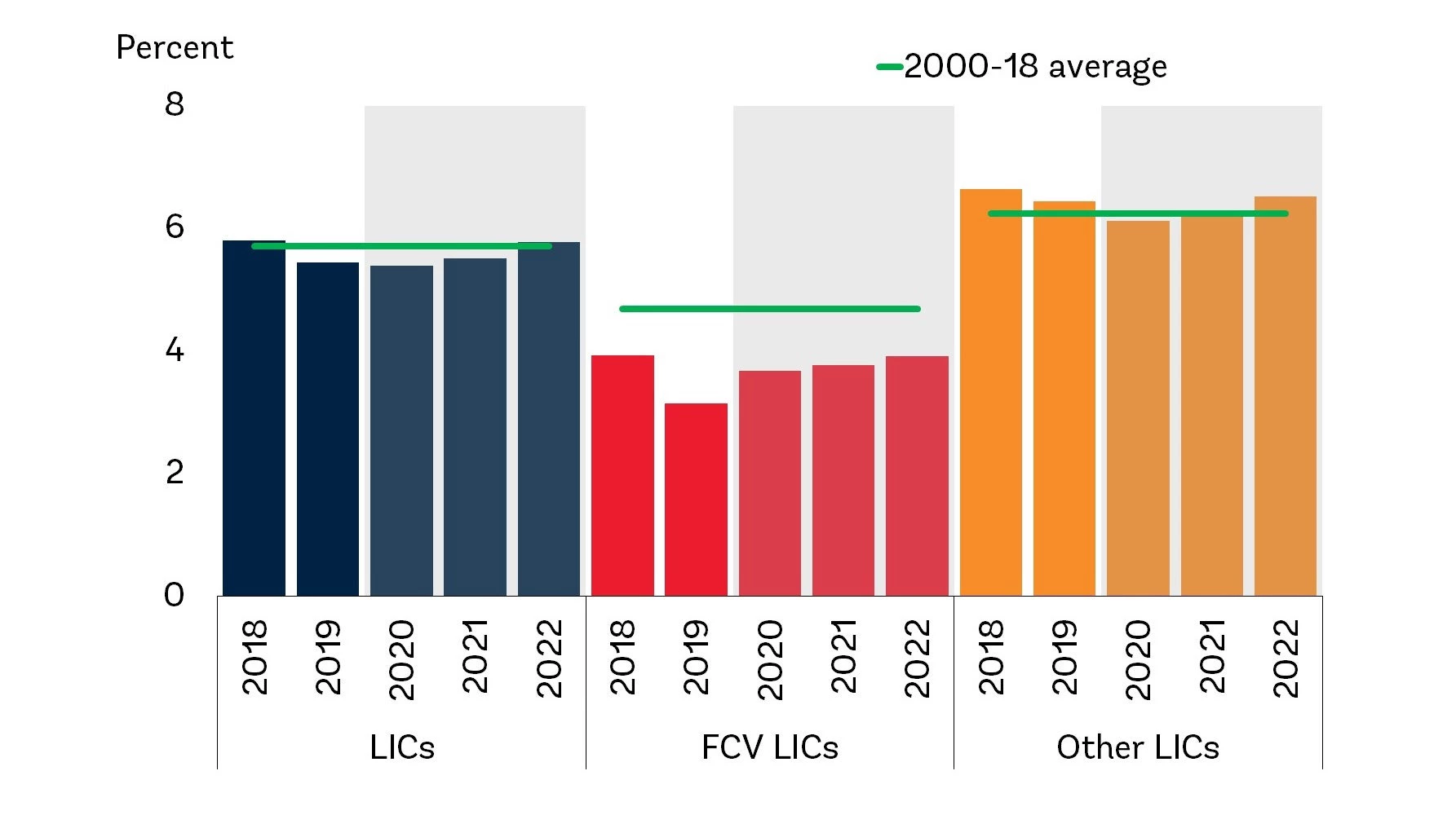 The weaker-than-expected performance in 2019 reflected a sharp fall in growth among fragile LICs. Growth in LICs is projected to remain at 5.4 percent in 2020 and edge up to an average of 5.7 percent over 2021-22. This assumes that fragile LICs recover as political stability improves (Afghanistan, Guinea-Bissau), investments in new capacity offset weaker external demand (Chad, Mozambique), and as rebuilding efforts boost activity (Mozambique). Among other LICs, activity is expected to be spurred by sustained public investment in infrastructure and private sector activity (Benin, Rwanda, Uganda). In some countries, more accommodative monetary policy amid relatively subdued inflation will support growth (Malawi, Tanzania). However, in Ethiopia—the largest LIC—growth is expected to slow due to tighter fiscal and monetary policy stances aimed at containing inflation.