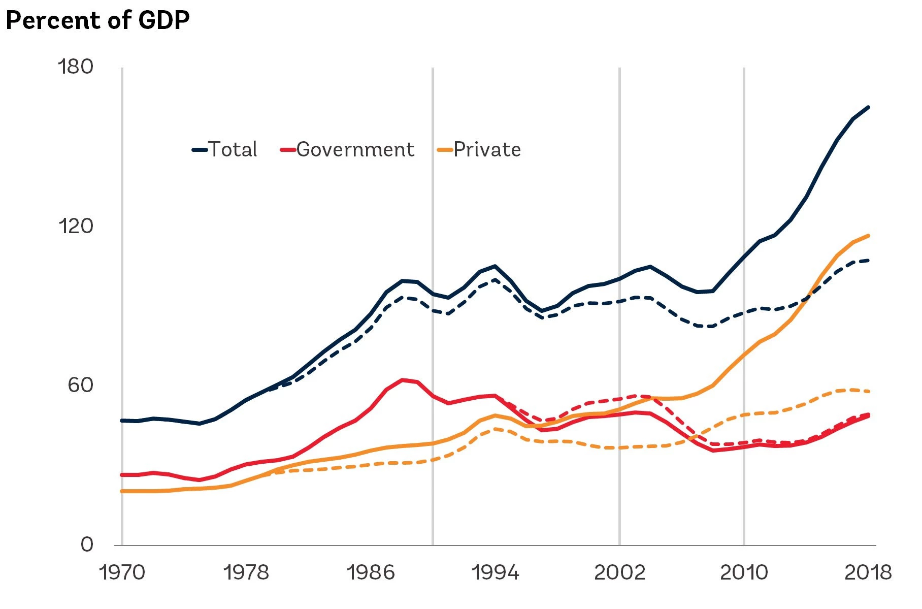 Over the past fifty years, there have been four historical waves of debt accumulation: 1970-89, 1990-2001, 2002-09, and since 2010. The latest wave, which started in 2010, has been the largest, fastest and most broad-based increase of the four.