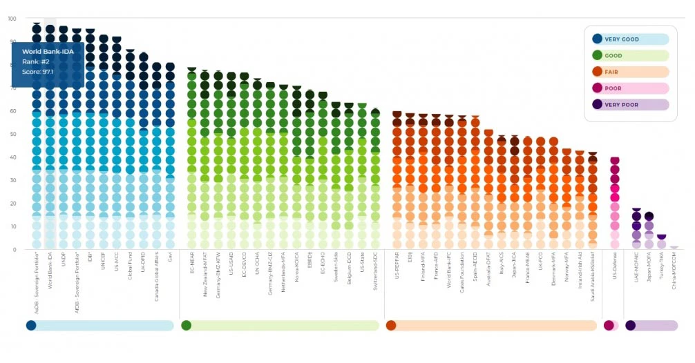 Produced by Publish What You Fund, the International Aid Transparency Index is an independent measure of aid transparency among the world’s major development agencies, based mostly on the publishing of data in the IATI standard. World Bank-IDA’s score this year is 97.1 out of 100, increased significantly from 86.1 in 2018, resulting in an improved ranking, jumping four spots from the 6th to the 2nd.