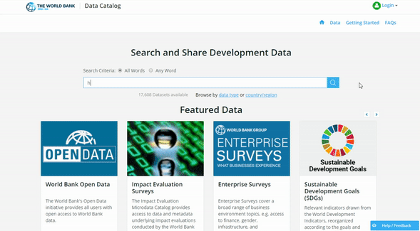 Por primera vez, puede buscar en un solo lugar los datos de encuestas, las series cronológicas y los datos geoespaciales para todas las regiones y temas. Y mejor aún, usted puede buscar dentro de los conjuntos de datos (i) los nombres de los indicadores y las variables. Este tipo de “búsqueda profunda” es ideal para encontrar datos que quizás no sabe que existen.