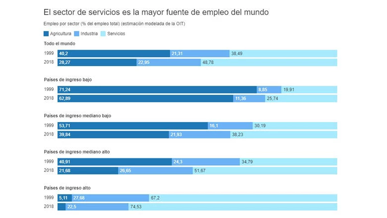 ¿Dónde pueden encontrar empleo? A principios de la década de 2000, el sector de servicios superó a la agricultura y se convirtió en la mayor fuente de empleo del mundo. En la actualidad, los servicios representan el 50 % del empleo, en tanto que la agricultura y la industria representan hasta el 30 % y el 20 %, respectivamente.
