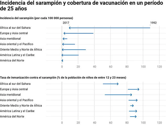 El sarampión es una enfermedad altamente contagiosa, pero se puede prevenir en la mayoría de los casos gracias a las vacunas y la inmunización generalizada. En el año 2000, se declaró que la enfermedad se había eliminado en Estados Unidos. Sin embargo, ha vuelto a aparecer. Los brotes registrados este año ponen de relieve el impacto de la inmunización no universal en Estados Unidos, Europa y en el mundo. Según datos preliminares de la Organización Mundial de la Salud (OMS), los casos registrados a nivel mundial aumentaron en 300 % (i) en los tres primeros meses de 2019, y diversos países enfrentan brotes de sarampión.