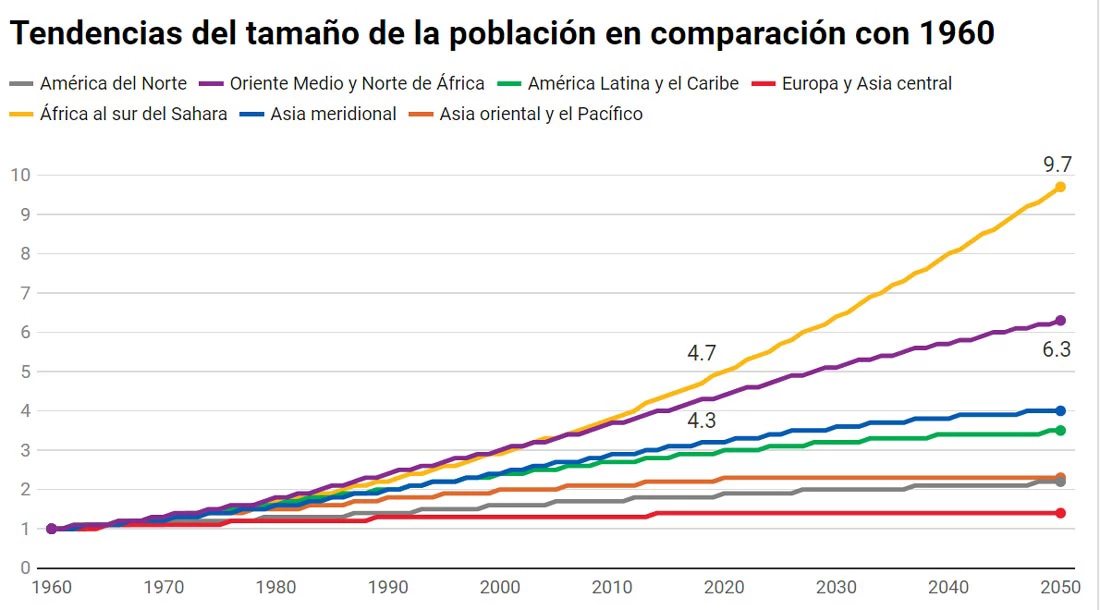 Se proyecta que la población mundial seguirá aumentando hasta llegar a casi 10 000 millones de habitantes en 2050. Mientras en otras regiones el crecimiento disminuirá marcadamente, se prevé que la población de África al sur del Sahara se duplicará en 2050, un aumento de casi 10 veces en comparación con 1960, pasando de 227 millones a 2200 millones de habitantes.