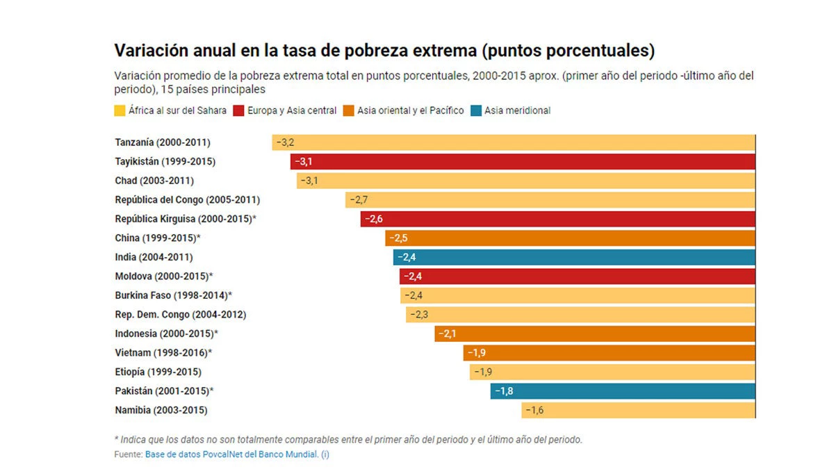 El gráfico a continuación muestra los 15 países que han registrado las mayores bajas anuales en puntos porcentuales de las tasas de pobreza extrema entre los años 2000 y 2015 , de un total de 114 países para los cuales podemos medir la pobreza de forma comparable en ese periodo.