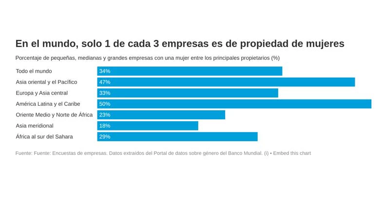 En el mundo, solo 1 de cada 3 empresas pequeñas, medianas y grandes es de propiedad de mujeres. Este porcentaje varía entre y dentro de las regiones, desde un mínimo de 18 % en Asia meridional a un máximo de 50 % en América Latina y el Caribe. En Asia oriental y el Pacífico, Corea del Sur registra la tasa más baja de mujeres dueñas de empresas, con apenas el 19 % de las empresas, y los Estados Federados de Micronesia tienen la tasa más alta, con el 87 % de negocios de propiedad de mujeres. De manera similar, en Oriente Medio, oscila entre un mínimo de 7 % en la República del Yemen y un máximo de 49 % en Túnez.