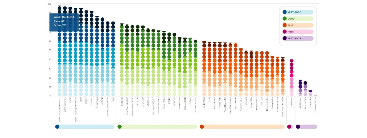 El Índice de Transparencia de la Ayuda (i), producido por Publish What You Fund (i), es la única manera independiente de medir la transparencia de la ayuda entre los principales organismos de desarrollo del mundo. Se basa principalmente en los datos publicados en la Norma IATI. El puntaje del Banco Mundial/AIF de este año fue de 97,1 de un total de 100, un aumento significativo con respecto al 86,1 obtenido en 2018. Esta puntuación le permitió avanzar cuatro puestos, del sexto al segundo lugar.