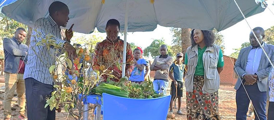 Gift Nkhata, phytopathologiste au village modèle de Sambizga Mphande, à Mzimba, montre comment détecter les maladies et les parasites et traiter les plantes apportées par les agriculteurs. Photo : David Ngoma
