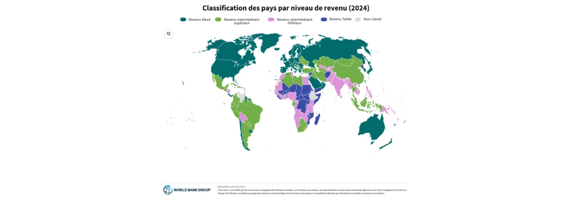 Le Groupe de la Banque mondiale catégorise les économies du monde[1] en quatre groupes : faible revenu, revenu intermédiaire de la tranche inférieure, revenu intermédiaire de la tranche supérieure et revenu élevé. Cette classification est mise à jour chaque année, le 1er juillet, date qui marque le début du nouvel exercice budgétaire. Elle est basée sur le revenu national brut (RNB) par habitant de l’année précédente, exprimé en dollars des États-Unis[2] et calculé selon la méthode de l’Atlas (a).