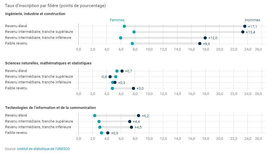 C’est dans l’enseignement supérieur que le déséquilibre hommes-femmes dans les filières STIM est flagrant . Dans le monde, il y a plus de femmes que d’hommes inscrits à l’université (112 femmes pour 100 hommes) et les taux d’obtention de diplômes sont plus élevés chez les femmes. L’Afrique subsaharienne fait toutefois figure d’exception : outre le très faible taux de poursuite des études au-delà du secondaire en général, les femmes sont encore moins nombreuses à s’inscrire à l’université (8 % contre 11 % pour les hommes).
