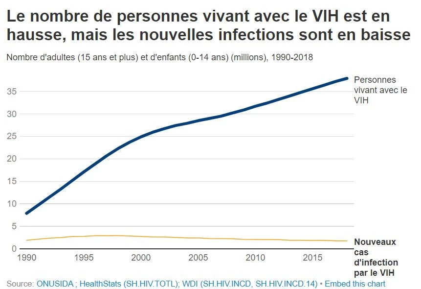 Le nombre de personnes vivant avec le VIH dans le monde est passé de 7,9 millions en 1990 à 37,9 millions aujourd'hui. Cependant, grâce à l'augmentation de la couverture du traitement du VIH, le nombre de décès est passé de 1,7 million par an en 2005 à 770 000 en 2018. Environ 23 millions de personnes (soit 61 % des personnes vivant avec le VIH) ont eu accès au traitement du VIH en 2018.