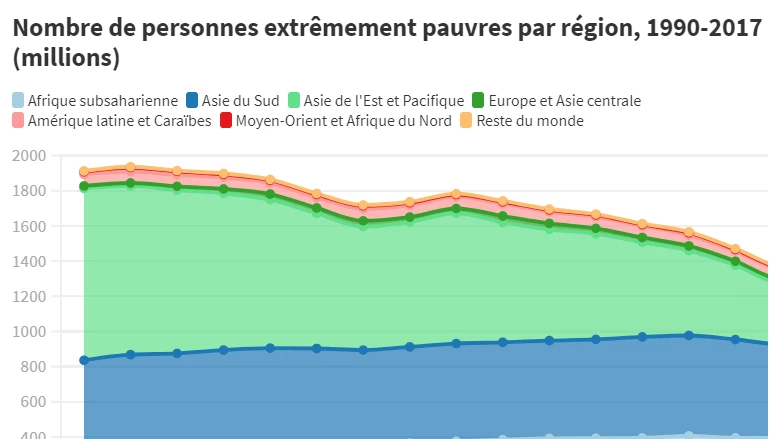 Alors que le nombre de pauvres a décliné dans de nombreuses régions, dont notamment l’Asie de l’Est-Pacifique et, plus récemment l’Asie du Sud, les chiffres ne rendent pas compte de la même tendance en Afrique subsaharienne, où le taux de pauvreté régional restait supérieur à 40 % en 2017. En dépit d’une légère baisse du taux de pauvreté dans la région, le nombre d’habitants vivant dans l'extrême pauvreté a au contraire augmenté, pour passer de 416 millions en 2015 à 431 millions en 2017. Résultat : l’Afrique subsaharienne concentre 60 % de la population pauvre mondiale. La région du Moyen-Orient et de l’Afrique du Nord a également enregistré ces dernières années une hausse du nombre de pauvres, imputable principalement aux pays en proie à des situations de conflit.