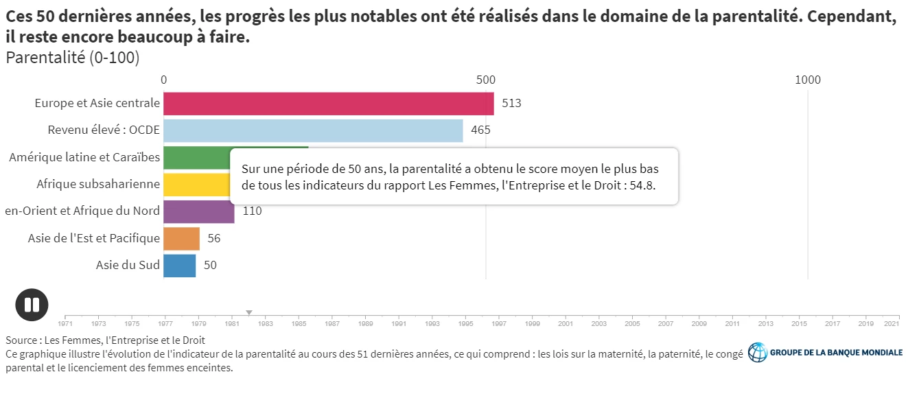 Malgré ces avancées, le rapport constate que la parentalité est le domaine où la marge de progression est la plus importante à l'échelle mondiale. Cet indicateur prend notamment en compte le droit à un congé parental rémunéré, le niveau de prise en charge des prestations par l’État et l'interdiction de licenciement des femmes enceintes. Des réformes sont aussi requises pour s’attaquer aux restrictions auxquelles se heurtent les femmes dans les types de professions, les tâches et les heures de travail autorisés et qui les cantonnent à des emplois moins bien rémunérés. Enfin, dans 100 économies, la législation n'impose pas l'égalité salariale entre les hommes et les femmes s’acquittant d’un travail d’une même valeur.
