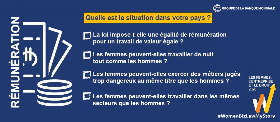 Des footballeuses aux ouvrières dans les usines, partout dans le monde, les femmes sont moins bien payées que les hommes pour la seule et unique raison que ce sont des femmes. Selon des estimations récentes, la rémunération des femmes à l’échelle mondiale ne représente que 77 % de celle des hommes. La législation est l'une des premières étapes dans la lutte contre ces inégalités salariales. La Banque mondiale a mis au point un indice qui permet d’évaluer le cadre législatif qui conditionne la place des femmes dans la vie économique pour 190 pays. Selon le rapport 2020 sur les Femmes, l'Entreprise et le Droit, le score moyen est d'à peine 66,1 sur 100 en ce qui concerne l'indicateur Rémunération (a). Autrement dit, 70 % des pays du monde disposent encore de lois et de règlements susceptibles de favoriser l'écart salarial entre les sexes.