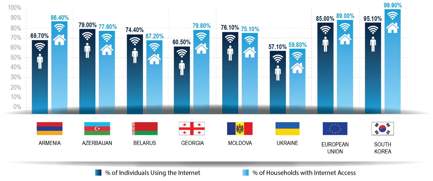 Առցանց տիրույթից մարդկանց դուրս պահող գործոնների վերաբերյալ մենք որոշ հուշումներ ենք ստանում՝ օգտվելով Արևելյան գործընկերության երկրների՝ Հայաստանի, Ադրբեջանի, Բելառուսի, Վրաստանի և Ուկրաինայի տնային տնտեսությունների ազգային հարցումներից: Համաշխարհային բանկն Արևելյան գործընկերության երկրներում աշխատում է Եվրամիության աջակցությամբ իրականացվող «ԵՄ-ն թվայնացման համար» նախաձեռնության շրջանակում, որի նպատակը լայնաշերտ համացանցի զարգացման իրենց ռազմավարությունների նախագծման և իրականացման հարցում երկրներին աջակցելն է: Երկրների նշված խմբում համացանցից կանոնավոր կերպով օգտվող անձանց մասնաբաժինը (յուրաքանչյուր երկրում հարցմանը նախորդած երեք ամիսների ընթացքում) տատանվում է Ադրբեջանի շուրջ 80%-ի ու Վրաստանի և Ուկրաինայի 50-60%-ի տոկոսի միջև: Նշված հարցումերից յուրաքանչյուրում ներառված են առցանց տիրույթում մարդկանց չգտնվելու մասին տարբեր հարցեր։ Պատճառները տարբեր են, և որոշ չափով հուշում են, թե պետական քաղաքականությամբ ինչպես կարելի է անել ավելին՝ ավելի մեծ թվով մարդկանց ներգրավելու համար: