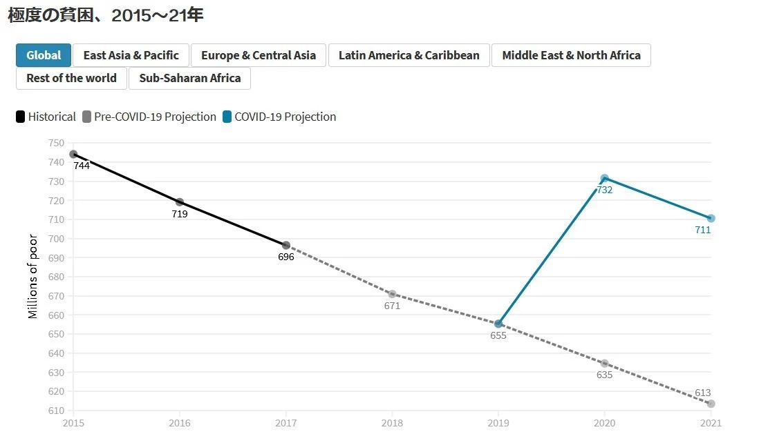 2020年、新型コロナウイルス感染症が世界中に広がり、成長予測が悪化する中、我々は今回の感染症危機が世界の貧困に与える影響について段階的に予測を引き上げた。これまでの試算同様、新型コロナウイルス感染症の影響による新たな貧困層の数とは、危機を加味した場合と、加味しなかった場合の差として算出している。加味した場合の予測では、「世界経済見通し(GEP)」の最新の成長予測を使い、加味しない場合は、危機以前のGEP2020年1月版の成長予測を使っている。2021年1月我々は、GEP2021年1月版の予測を使い、今回の危機により2020年に世界全体で1億1,900万人から1億2,400万人が極度の貧困に陥ったと推定した。
