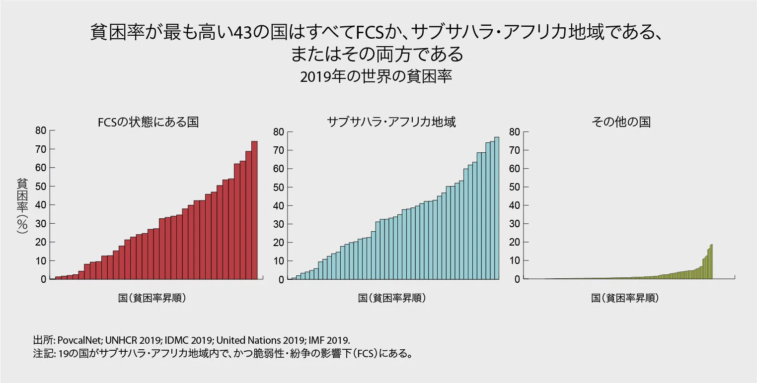 さらに報告書は、世界に明確な境界線があると指摘している。2019年の世界各国の貧困をみると、貧困率が最も高い43の国はすべて、FCSか、サブサハラ・アフリカ地域かのどちらかで、3分の1以上の国は両方に属し、43すべての国で人口の5分の1以上が極度の貧困状態に置かれている。