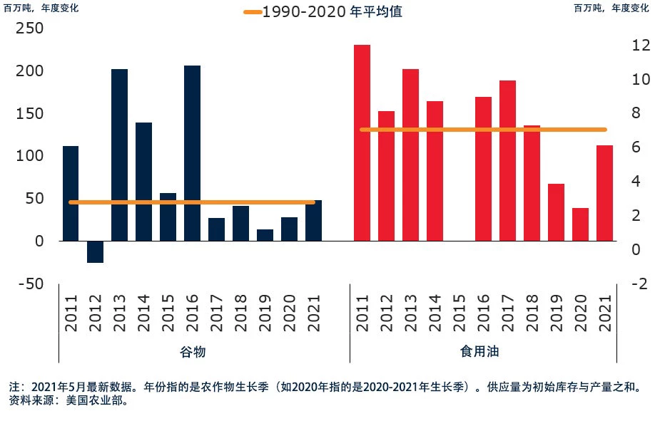 2021年至2022年,全球食物供应量有望增长。美国农业部2021年5月发布的最新数据显示,2021年至2022年,三种主要粮食作物(小麦、玉米和水稻)的全球总产量【本生长季(2020年9月至2021年8月)将稳步增长1.2%】有望增长约3.2%(或7600万吨)。与此类似,主要食用油的全球供应量预计将增长2.5%(或5700万吨)。这两种增幅接近于其长期平均值。