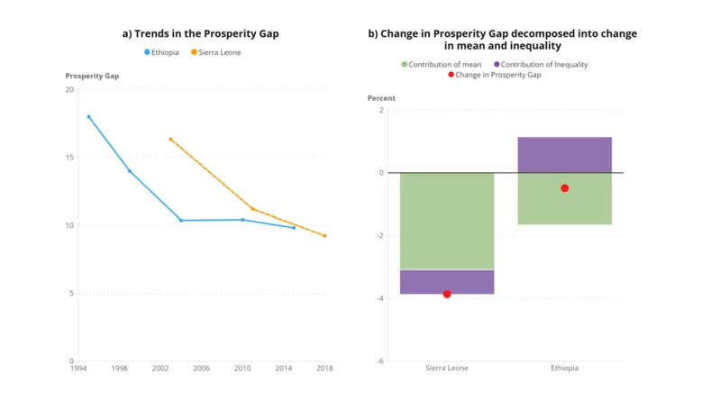 从2004年到2018年,塞拉利昂的繁荣差距每年减少 3.86%,这来自平均收入每年增加3.08%、不平等每年减少 0.78%(两因素之和等于繁荣差距的变化)。相比之下,埃塞俄比亚则几乎停滞不前,繁荣差距每年仅减少0.49%。尽管埃塞俄比亚的平均收入以每年1.64%的速度增长,但却被每年1.14%的不平等上升所抵消。塞拉利昂之所以能够赶上,是因为它不仅平均收入增长较快(比埃塞俄比亚高出1.44个百分点),而且不平等的改善速度更快(与埃塞俄比亚的差别为1.92个百分点)。