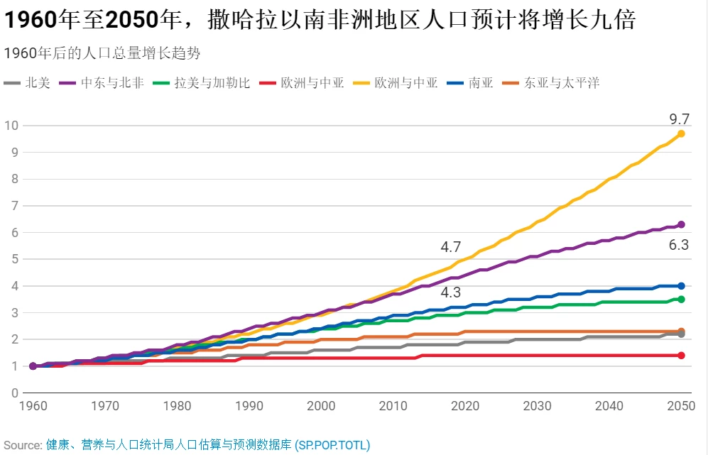 根据预测,世界人口将继续增长,到2050年将达近百亿。尽管其它地区的人口增速将显著放缓,但到2050年,撒哈拉以南非洲地区人口预计将翻番,较之1960年增长近九倍,即从2.27亿增至22亿。
