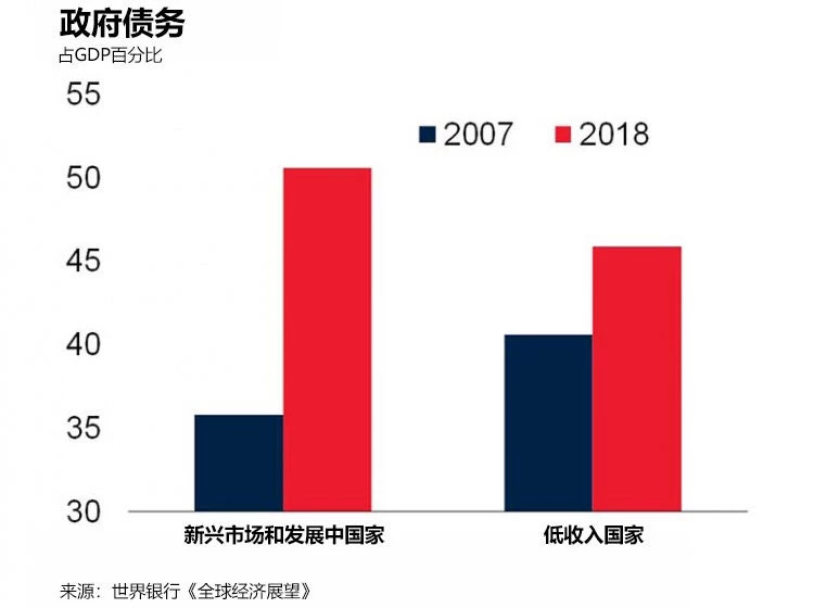 新兴市场和发展中国家的政府债务大幅增加,占GDP的比例从2007年的平均15%到2018年已升至50%。2018年年底世界最贫困国家的外债存量已高达3870亿美元,比10年前的水平增加了一倍还多。事实上,撒哈拉以南非洲半数以上国家的债务存量都增加了一倍,有些国家增幅更为突出:埃塞俄比亚885%,赞比亚521%,乌干达437%,加纳395%。